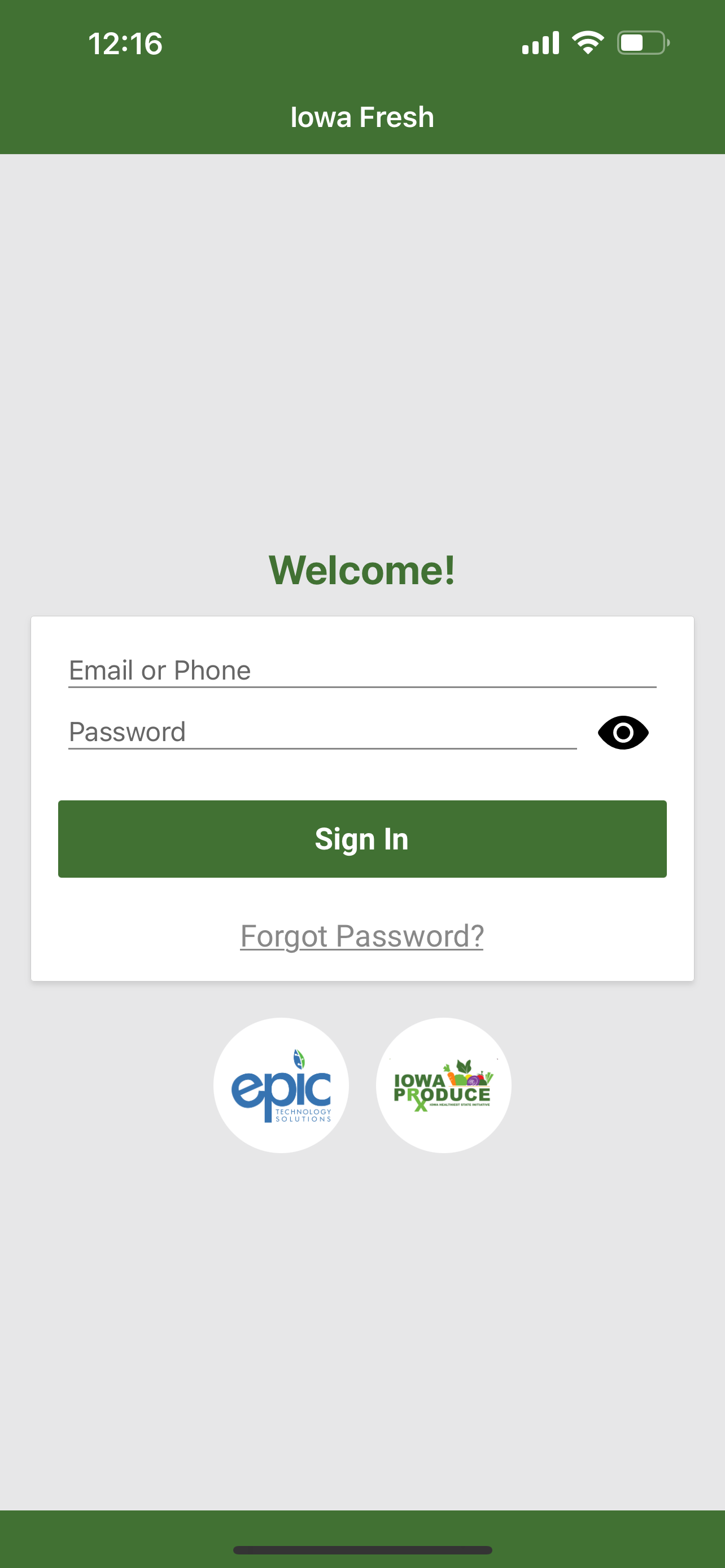 After you click on the app icon to open Iowa Fresh on your smartphone, you will be asked to enter your phone number or your e-mail address (if you provided one).
